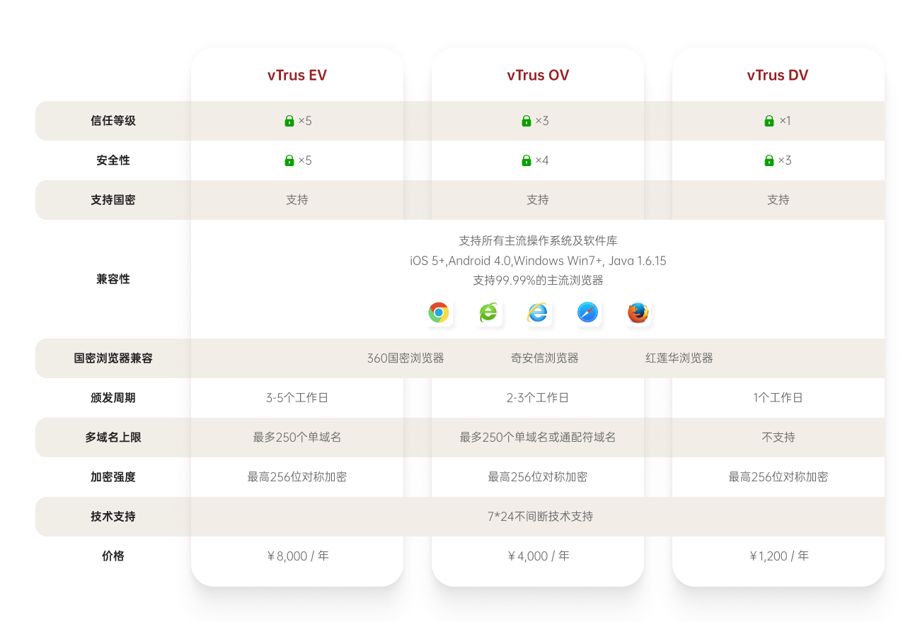 vTrus是天威誠信基于 Webtrust標(biāo)準(zhǔn)和中國可信CA認(rèn)證標(biāo)準(zhǔn)的國產(chǎn)證書品牌,全面支持RSA算法和國密SM2算法,已完成各大瀏覽器及主流國密算法瀏覽器可信根預(yù)埋。