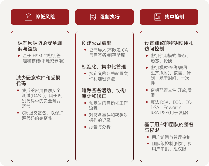 是一種數(shù)字信任解決方案,可跨軟件供應(yīng)鏈保護(hù)軟件的完整性,降低代碼泄露風(fēng)險(xiǎn),強(qiáng)制執(zhí)行企業(yè)和監(jiān)管策略,并提供細(xì)致的密鑰使用和訪問控制。
