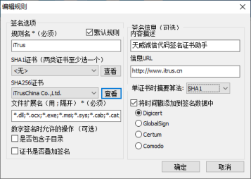 自定義一個規(guī)則名稱,并選擇當前規(guī)則下調用的證書文件、當前規(guī)則支持的文件擴展名。如果采用文件夾拖放格式,還可以設置規(guī)則中是否需要對該文件夾下的子目錄中的文件進行簽名。