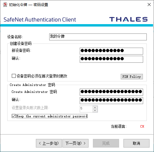 設(shè)置“New Digital Signature PIN”默認(rèn)要求密碼6-16位字符,設(shè)置“New Digital Signature PUK” 默認(rèn)要求密碼6-16位字符,點(diǎn)擊“完成”。 彈窗提示:即將初始化設(shè)備,點(diǎn)擊“確定”。