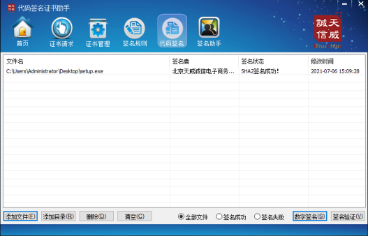 點(diǎn)擊“數(shù)字簽名”,選擇簽名模式(應(yīng)用模式 或 驅(qū)動模式),證書助手將自動為簽名列表中的程序添加簽名信息。