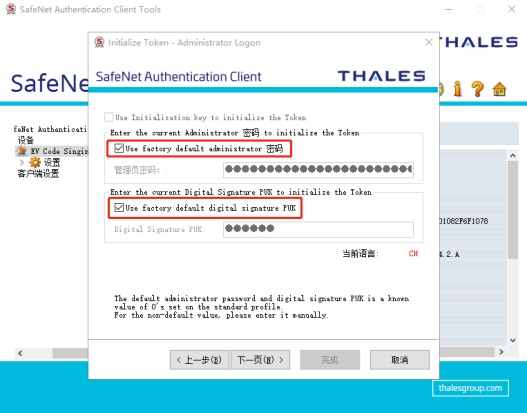 勾選Use factory default administrator 密碼和Use factory default digital signature PUK兩個選項(xiàng),然后點(diǎn)擊“下一頁”。
