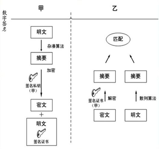 乙一方面將甲發(fā)送的密文通過(guò)甲的簽名證書解密得到摘要,另一方面將明文采用相同的雜湊算法計(jì)算出摘要;