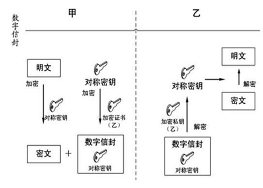 甲使用信息接收方(乙)的加密證書中的公鑰,加密對(duì)稱密鑰,得到數(shù)字信封;
