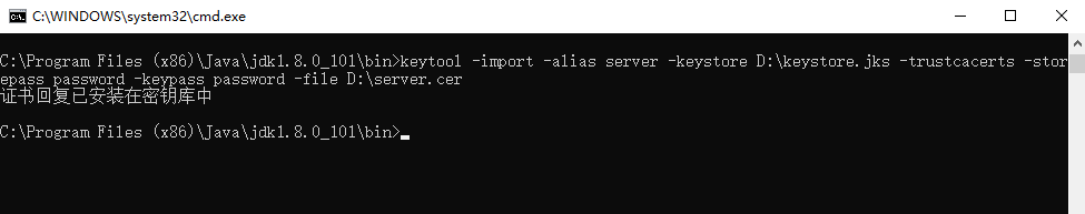 keytool -import -alias server -keystore D:\keystore.jks -trustcacerts -storepass password -keypass password -file D:\server.cer