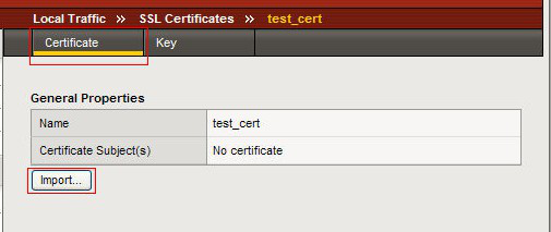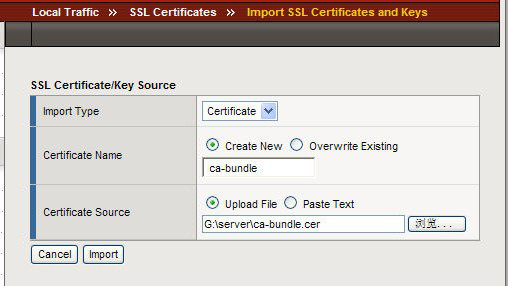 選擇Local Traffic-〉SSL Certificates 在 SSL Certificate List 主界面點(diǎn)擊右上角“Import”,將生成的 ca-bundle.cer 使用“Certificate”方式導(dǎo)入。