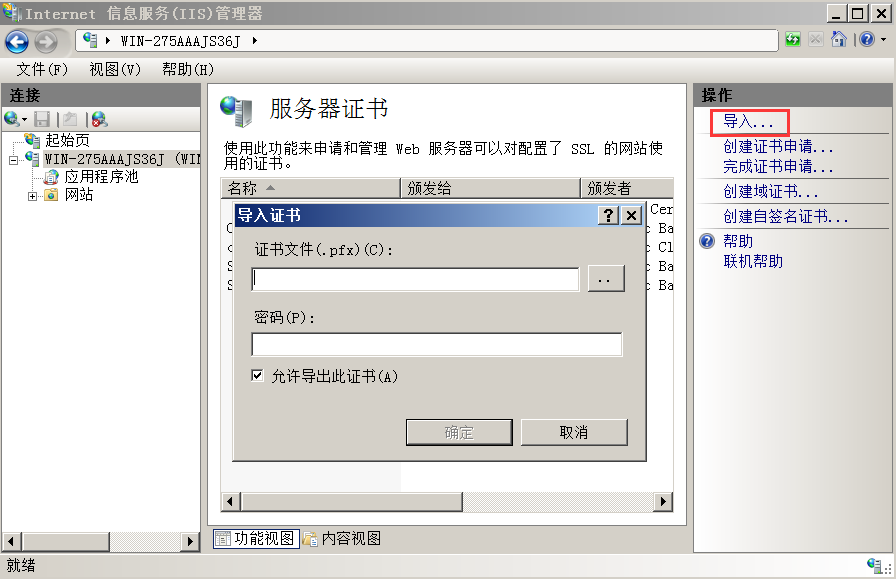 然后進入IIS管理控制臺的服務(wù)器證書管理頁面,右鍵選擇“導(dǎo)入”