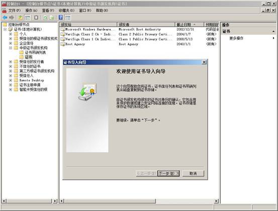 通過證書向?qū)?dǎo)入中級CA證書intermediate1.cer,