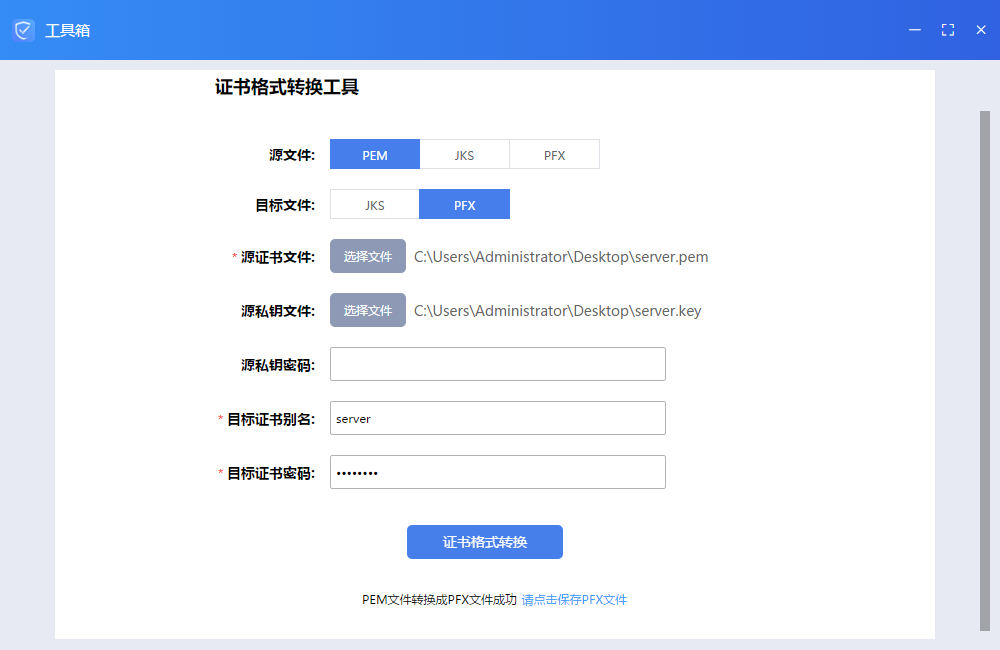 點擊工具箱,點擊證書格式轉(zhuǎn)換,源文件選擇pem,目標(biāo)文件選擇pfx,在源證書文件中錄入server.pem,源私鑰文件中錄入server.key文件。(源私鑰密碼處為空)