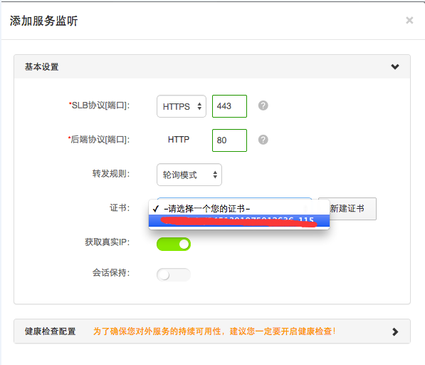 在SLB實例中配置SLB轉(zhuǎn)發(fā)偵聽規(guī)則。SLB協(xié)議選擇“HTTPS”,端口“443”,后端協(xié)議選擇“HTTP”端口選擇“80”(根據(jù)實際的后端應用服務端口填寫),證書 選擇創(chuàng)建的證書自定義名稱。