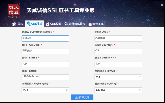 按照工具提示的信息填寫您申請國密證書的真實信息,點擊生成CSR文件。下圖為填寫示例: