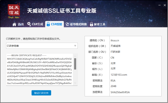 字符串校驗:您可以打開制作的CSR文件,并把字符串復(fù)制到空白框中并點擊“驗證CSR文件”。