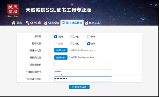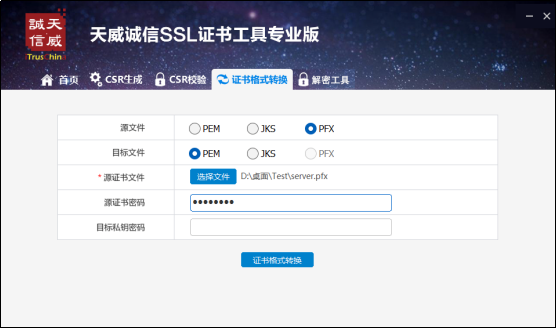 1,“源證書文件”中選擇您需要轉(zhuǎn)換的.pfx格式文件,并設(shè)置PFX文件密碼。