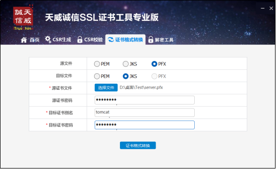 2,在“目標(biāo)證書別名”選擇中這是PFX文件密鑰別名,并在“目標(biāo)證書密碼”中設(shè)置PFX文件密碼。