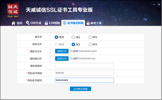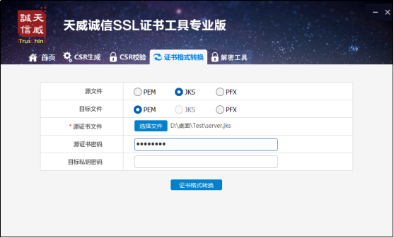 1,“源證書文件”中選擇您需要轉(zhuǎn)換的.jks格式文件,并設(shè)置JKS文件密碼。