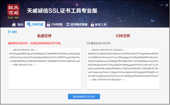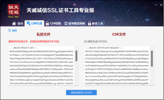 通過點擊保存私鑰文件和CSR文件,保存文件到本地。私鑰文件您需要在本地備份并妥善保管,CSR申請文件需要提交給商務(wù)人員。