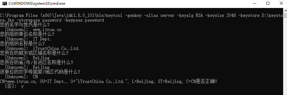 一、 生成證書請(qǐng)求1. 生成keystore文件生成密鑰庫(kù)文件keystore.jks需要使用JDK的keytool工具。命令行進(jìn)入JDK或JRE下的bin目錄,運(yùn)行keytool命令(示例中粗體部分為可自定義部分,可根據(jù)實(shí)際配置情況相應(yīng)修改)。keytool -genkey -alias server -keyalg RSA -keysize 2048 -keystore D:\keystore.jks -storepass password -keypass password