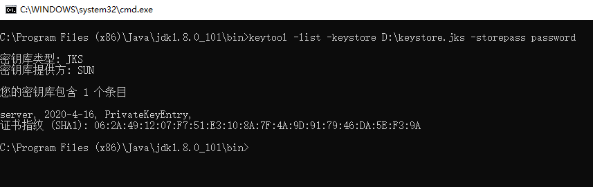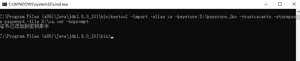 導(dǎo)入服務(wù)器證書keytool -import -alias server -keystore D:\keystore.jks -trustcacerts -storepass password -keypass password -file D:\server.cer