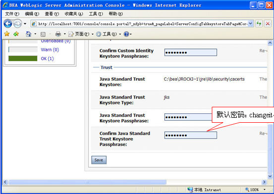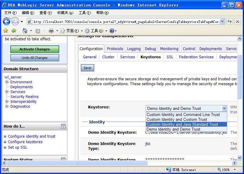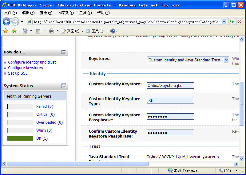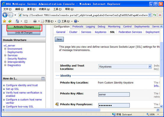 三,安裝服務(wù)器證書1. 導(dǎo)入keysotre密鑰庫(kù)登陸Weblogic控制臺(tái)