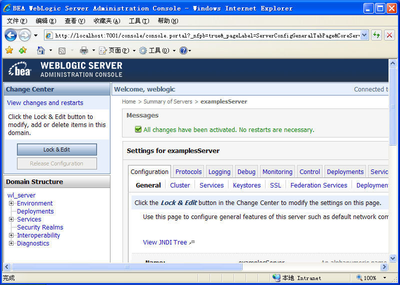 設(shè)置完成后,選擇“Active Changes”,保存所有修改。如果系統(tǒng)提示需要重啟Weblogic,則您需要重啟后才能使配置生效。
