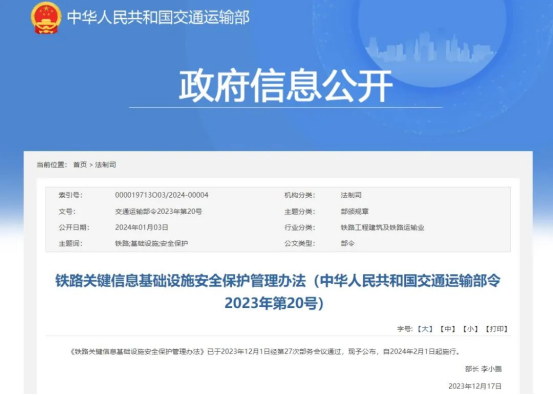 近日,交通運輸部公布了《鐵路關(guān)鍵信息基礎(chǔ)設(shè)施安全保護(hù)管理辦法》(以下簡稱《辦法》),自2024年2月1日起施行。《辦法》共6章30條,旨在加快建立鐵路關(guān)鍵信息基礎(chǔ)設(shè)施全過程保護(hù)制度,加強(qiáng)對鐵路關(guān)鍵信息基礎(chǔ)設(shè)施的監(jiān)督管理和保障。